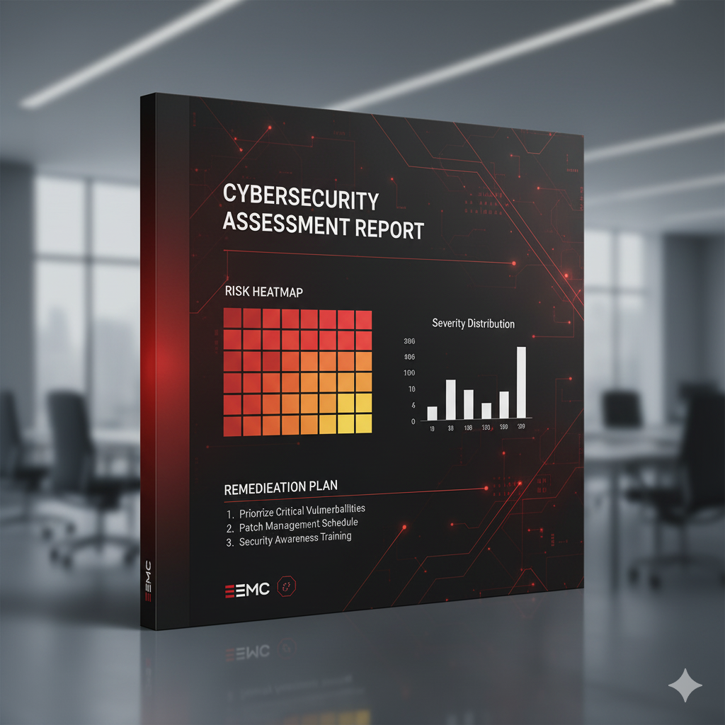 Risk heatmap, key findings, before/after posture, and next steps.